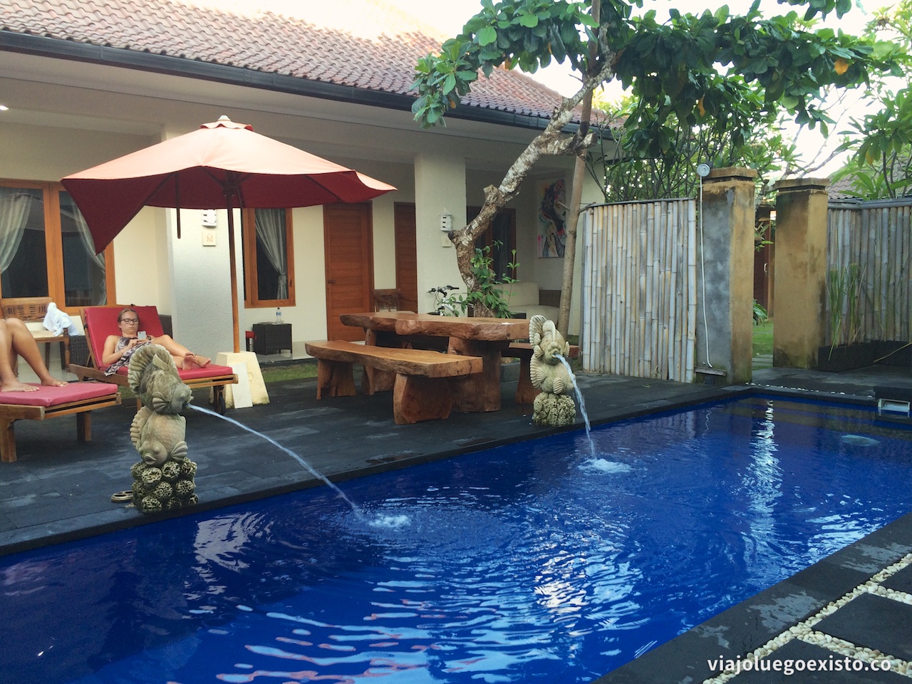 Por 210.0000 rupias (unos 13€), nos alojamos en el Dewi Dewi Villas en Sanur. El hotel es muy bonito, un oasis de paz en medio de las callejuelas del pueblo. Es una especie de apartamento, con aire acondicionado, desayuno incluido, wifi (no funciona excesivamente bien) y una piscina a dos pasos de la habitación que se agradece mucho en las horas de calor.