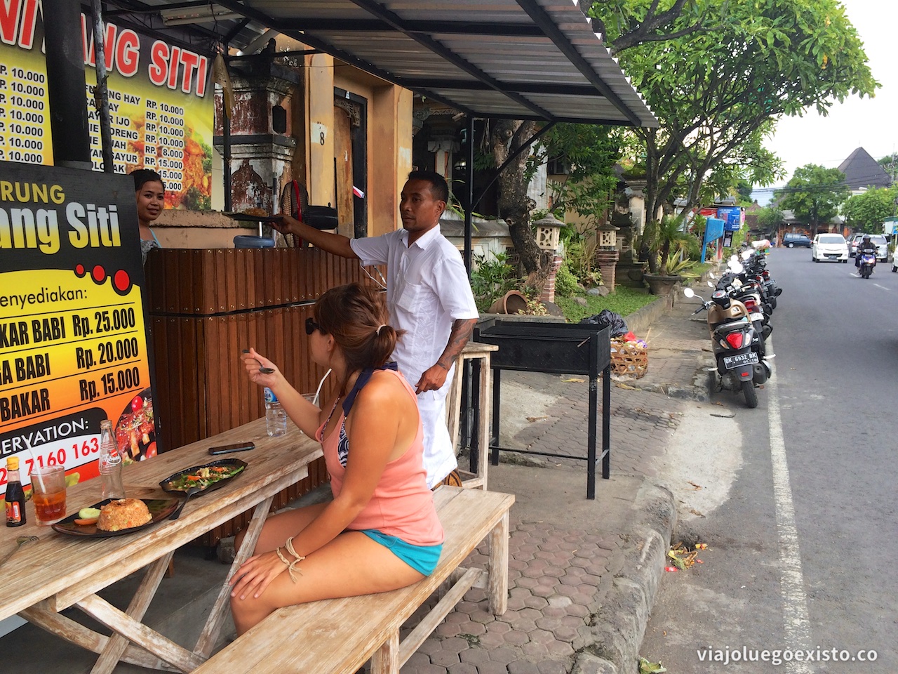 Llegamos al aeropuerto principal de Bali (Denpasar), allí cogimos un bus hasta Sanur, en esta zona es donde los primeros resorts de Bali empezaron a construirse y hoy por hoy hay diferentes tipos de alojamientos y restaurantes y una buena opción para pasar unos días antes de ir a Ubudo o Nusa Lembongan por ejemplo (en información útil os explico más detalles de cómo llegar en transporte público y así evitar pagar taxi), llegamos hasta el hotel que habíamos reservado que se llama Dewi Dewi Villas y era el primero que teníamos con piscina y allí nos reencontramos con un viejo amigo de Marcio y su pareja, David y Victoria, que son absolutamente encantadores. Fueron ellos quienes nos llevaron al warung Niyan Siti (un warung suele ser un restaurante pequeño, familiar y modesto en Indonesia), local al que iríamos mucho el resto de días por cumplir con todos los requisitos: bueno, bonito y barato y además una familia de lo más amable y acogedora.