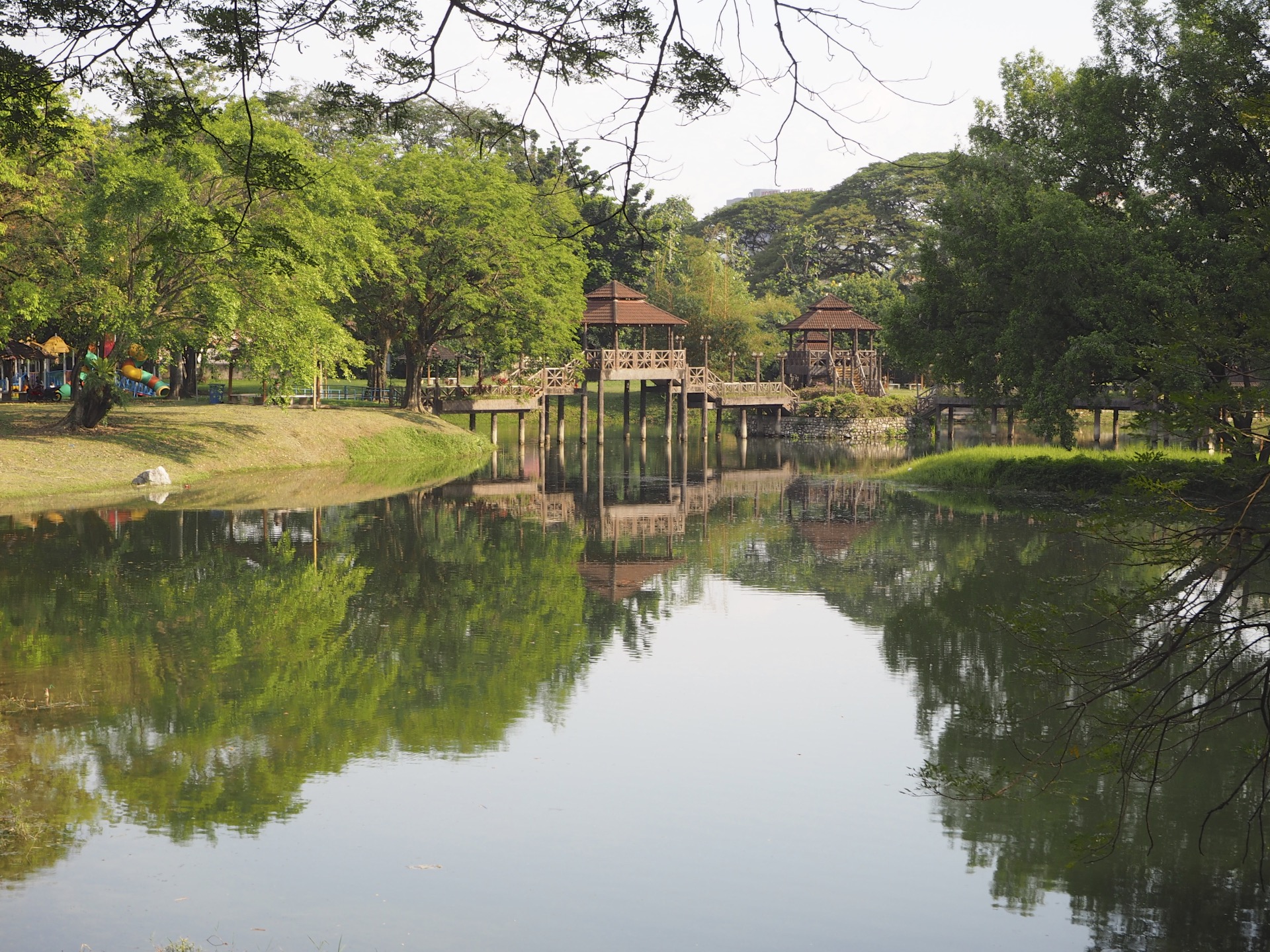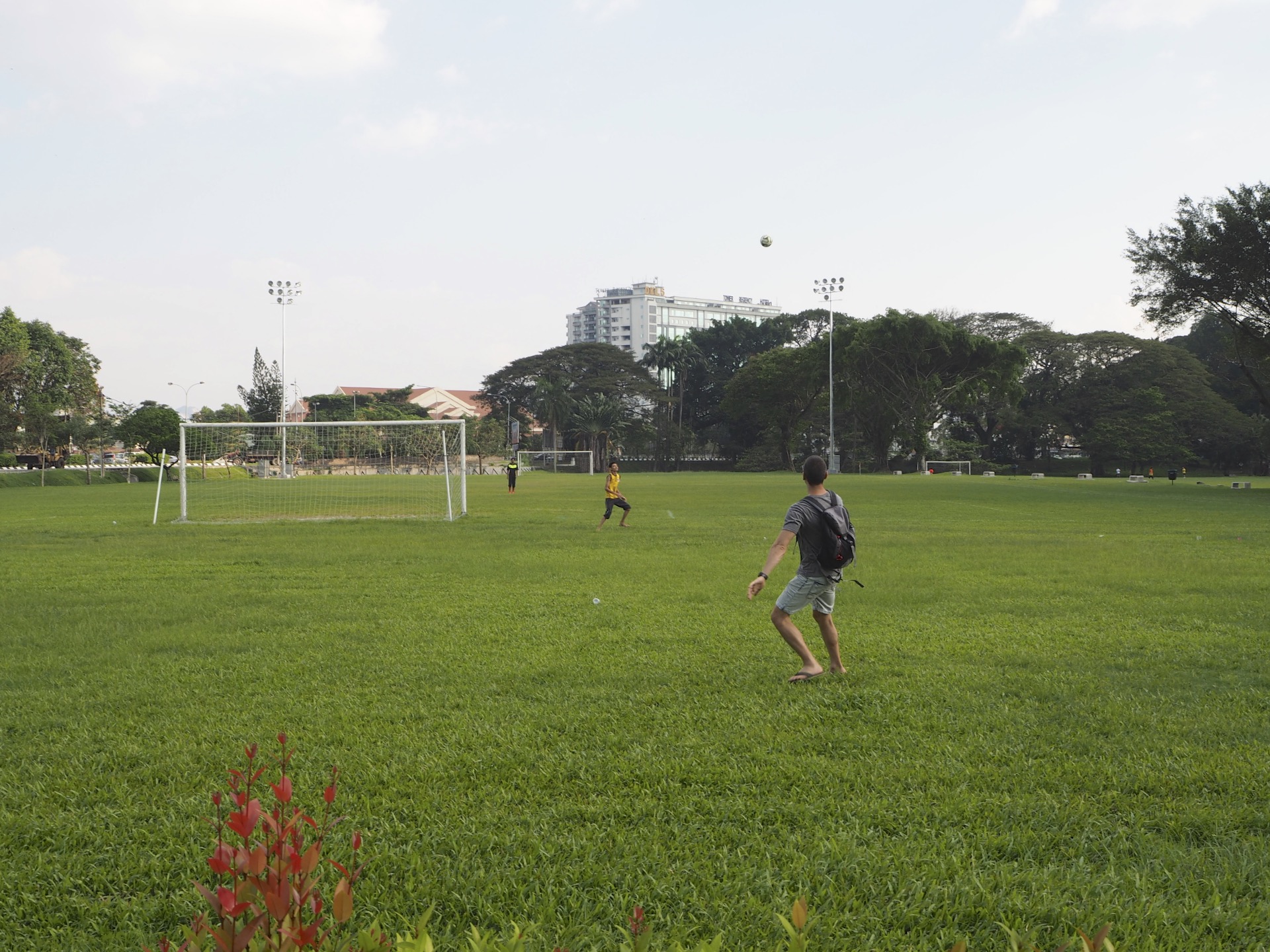 Después de comer el riquísimo Nasi Ayam estuvimos paseando a lo largo del río, cruzándonos con pescadores o jóvenes pasando la tarde, y casi sin querer llegamos a un parque que nos encantó, el D.R. Seenivasagam Park, con enormes espacios verdes para relajarse o jugar (aquí por fin vi a niños jugar a fútbol en Malasia).