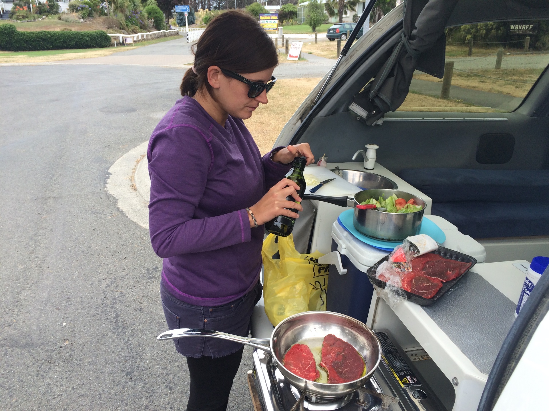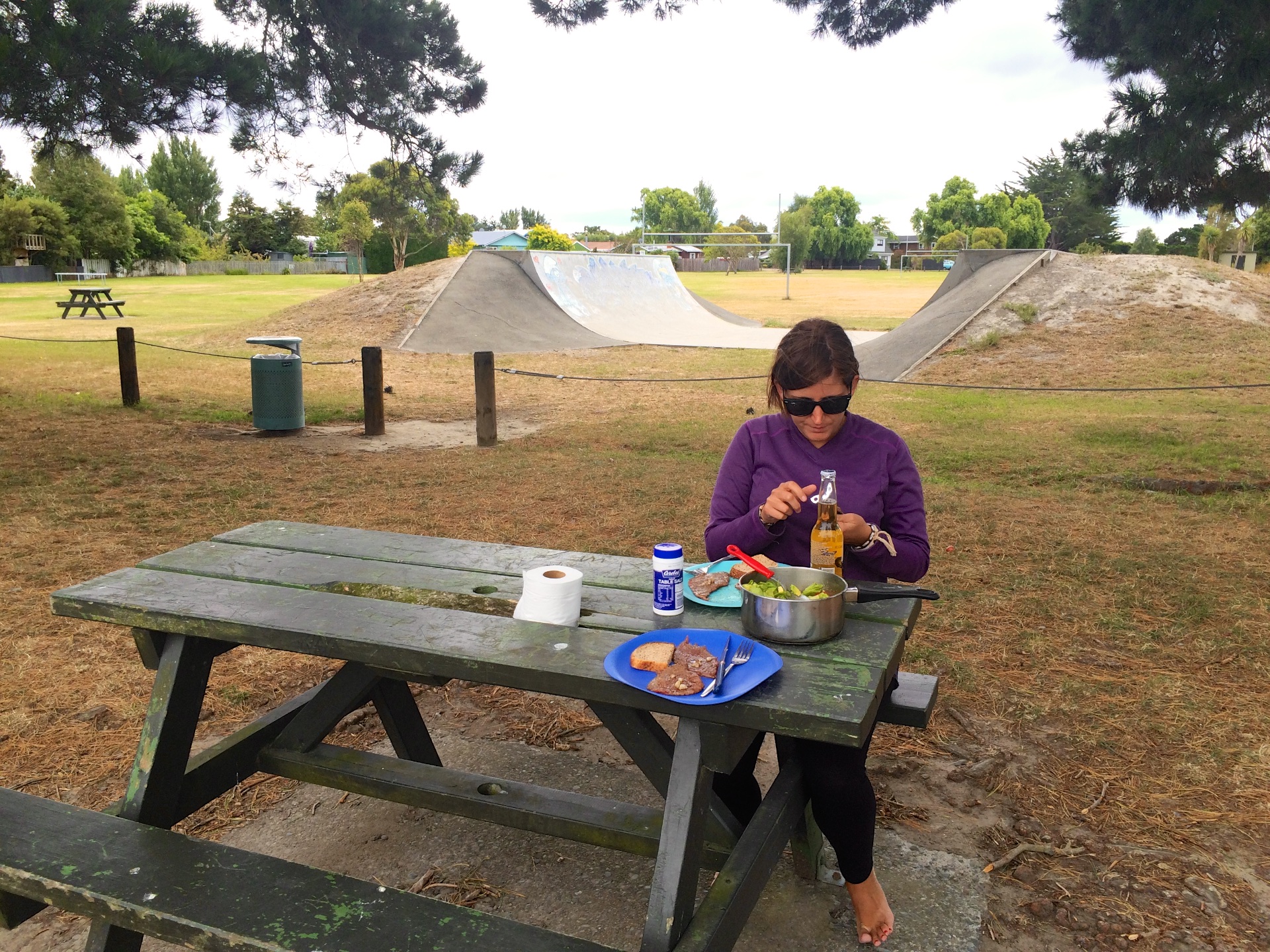 Después de la parada seguimos recorriendo la costa pero no nos dio tiempo de llegar a nuestro destino, nos quedamos en un camping en frente de la playa. Nueva Zelanda está preparadísima para recorrerla con campervan, llena de campings privados y públicos con servicios de todo tipo. La primera noche fue rara como no podía ser de otra manera, preparamos la “cama” y cuando nos fuimos a dormir empezó a diluviar, pero estábamos tan cansados que caímos rendidos en un abrir y cerrar de ojos.