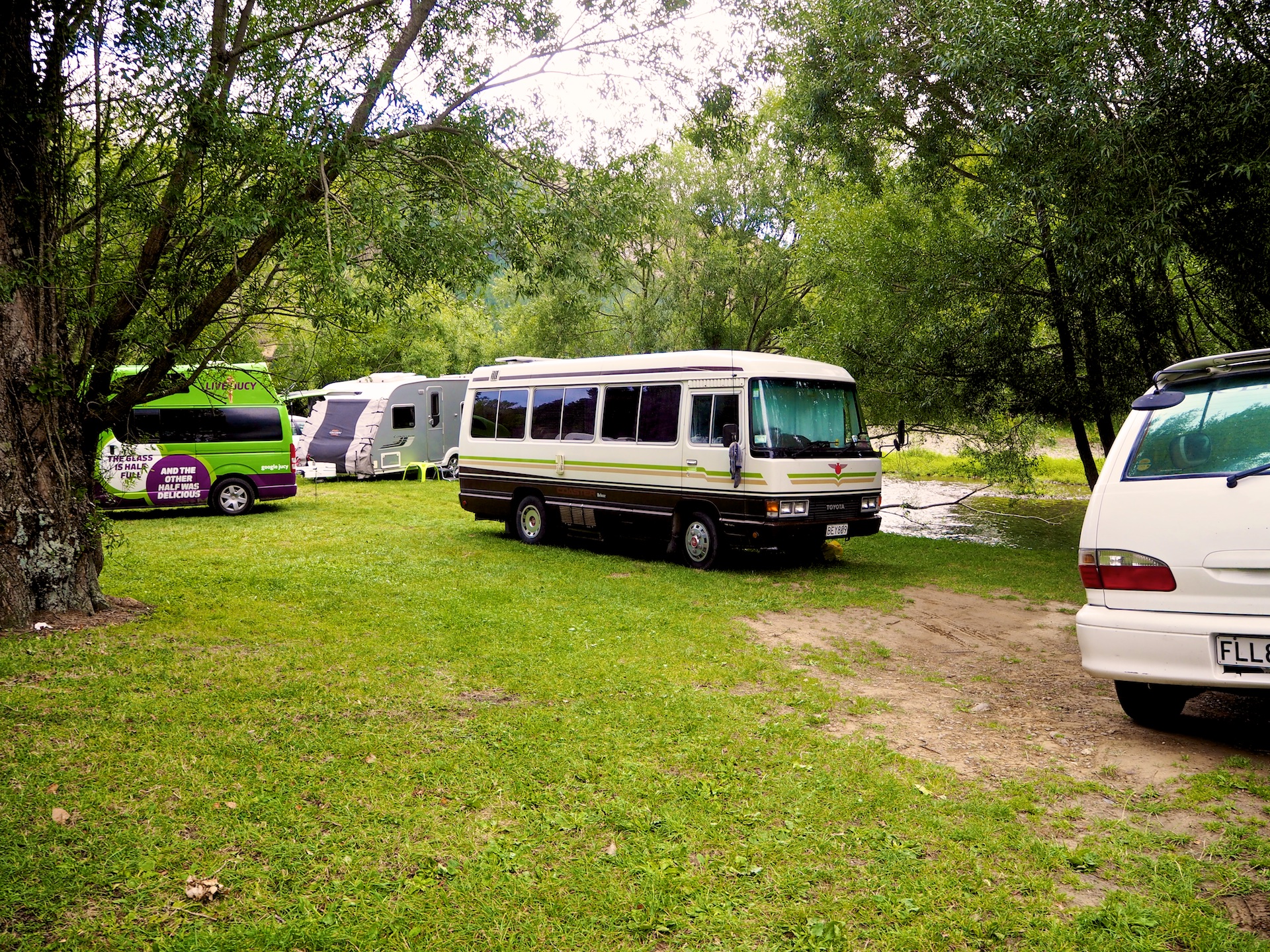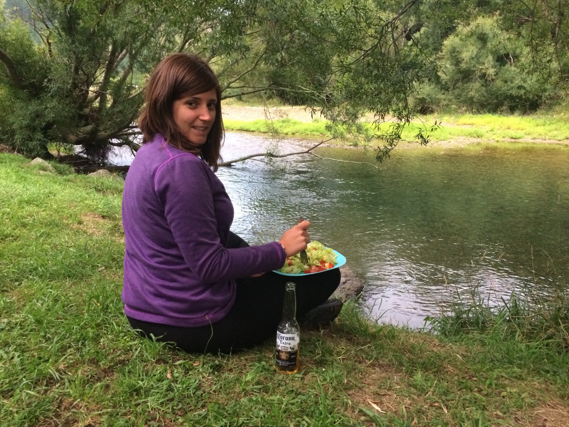 Es inevitable que durante el trayecto te vayas parando en varios sitios, a echar alguna que otra foto y a admirar el paisaje. Llegamos hasta Brown River Reserve, una zona pública del Departamento de Conservación (DOC) donde acampamos gratis con unos cuantas caravanas más, ni que decir tiene que la nuestra era la más cutre con diferencia, pero ahí estábamos disfrutando igual de la aventura. Y en frente del río cocinamos, cenamos y hasta fregamos los platos, y luego a descansar que al día siguiente nos esperaban muchos más kilómetros.