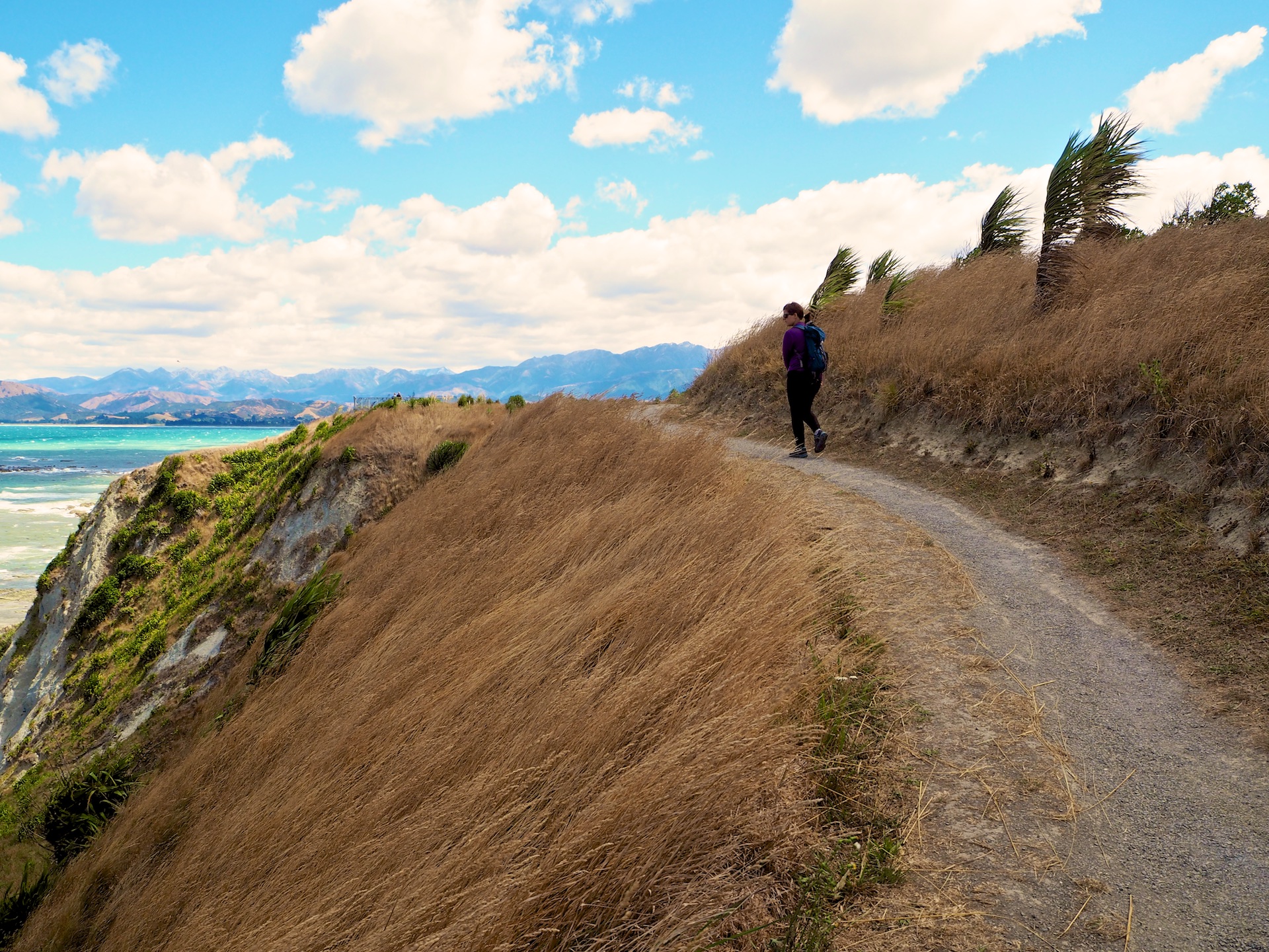 Así que nos decidimos a hacer el trekking de Kaikoura Peninsula Walkway (unos 12 km.), tardamos cerca de 4 horas y básicamente consistió en recorrer la península en círculo, recorrimos toda la calle principal hasta la zona donde acaba la carretera y empieza la subida por la colina, y nada más llegar vimos a un par de focas tomando el sol tranquilamente, sin inmutarse frente a los pocos turistas que disfrutábamos el momento.