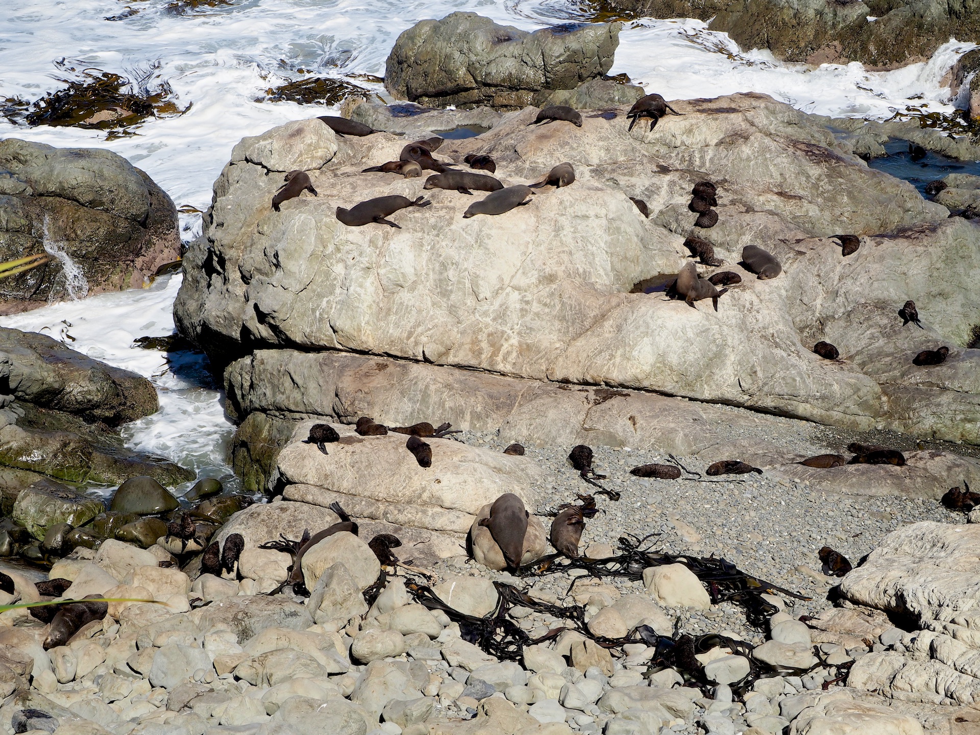 Al acabar de comer salimos con la furgoneta hacia el norte siguiendo la costa, la carretera seguía siendo alucinante, nos paramos en Ohau Point donde hay una colonia de focas, en la época del año que fuimos nosotros habían muchas crías, revoloteando y jugando con los charcos que las olas dejaban en las rocas, además hicimos una pequeña caminata bordeando un riachuelo por el bosque hasta llegar a una cascada, donde también te puedes encontrar crias jugueteando.