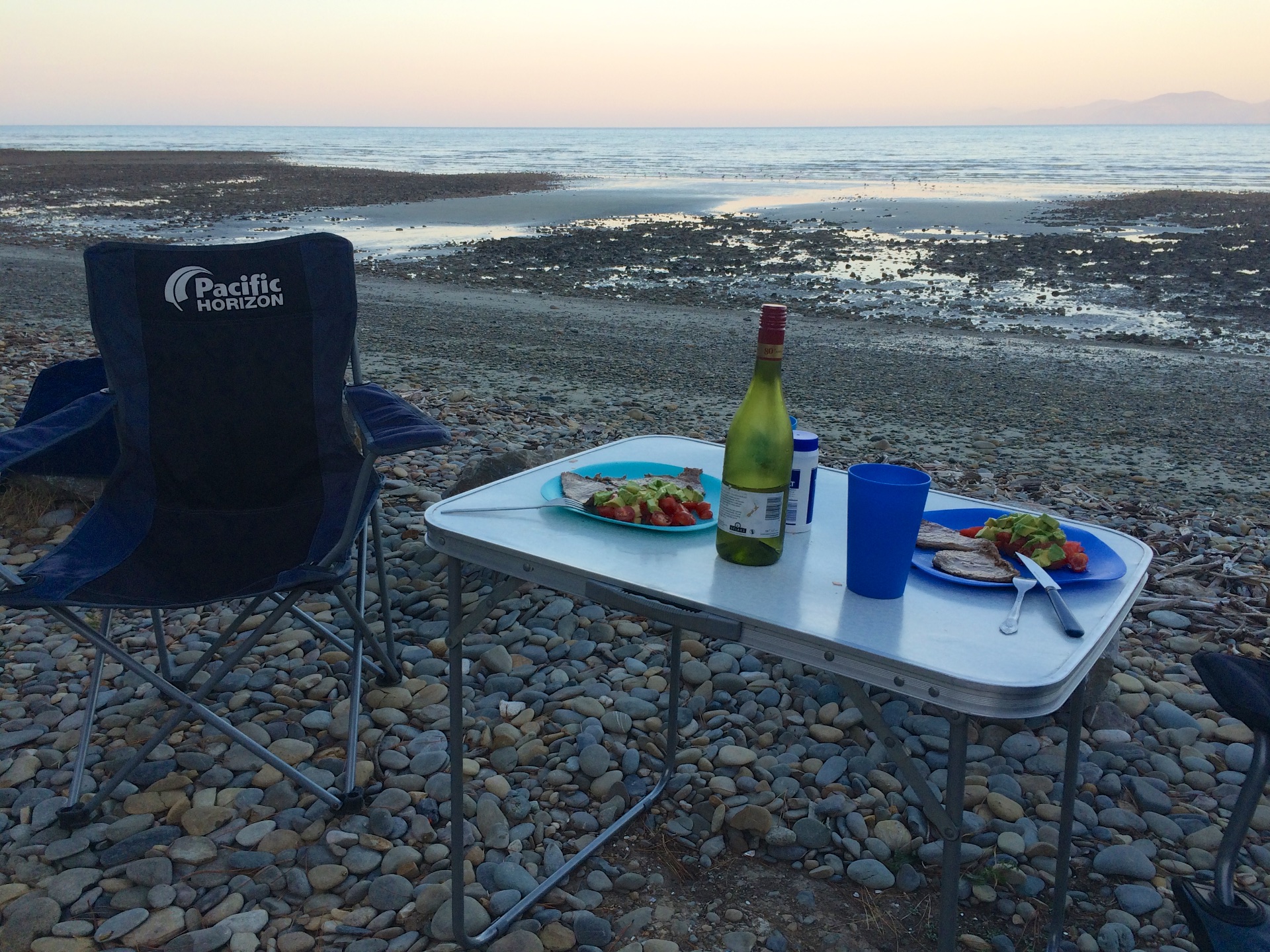 Esa noche fue realmente especial. ¿Vale la pena haber dejado un curro, haberte quedado sin piso, el estrés de los meses previos haciendo los preparativos, y la pena de no poder ver a gente que tantísimo quieres? Por supuesto que vale la pena, sobretodo por momentos como éste. Os pongo en contexto: Ponemos la furgo justo donde empieza la playa, sacamos la mesa y las sillas plegables, y así, en un momento, nos hemos preparado un ambiente idílico, sólo nos faltaban las velas, porque el paisaje era para quitarte el sentío. Nos hicimos un bistec de ternera a la plancha que era otro nivel de delicia, y lo acompañamos de una ensaladita de tomate y aguacate. Teníamos vino blanco, ¡y encima estaba fresquito!!! Los cubiertos eran de plástico si, pero no hubiera podido competir con ese momento ni un restaurante con estrella michelín. Y con el sonido de las olas de fondo, compartimos una velada única.