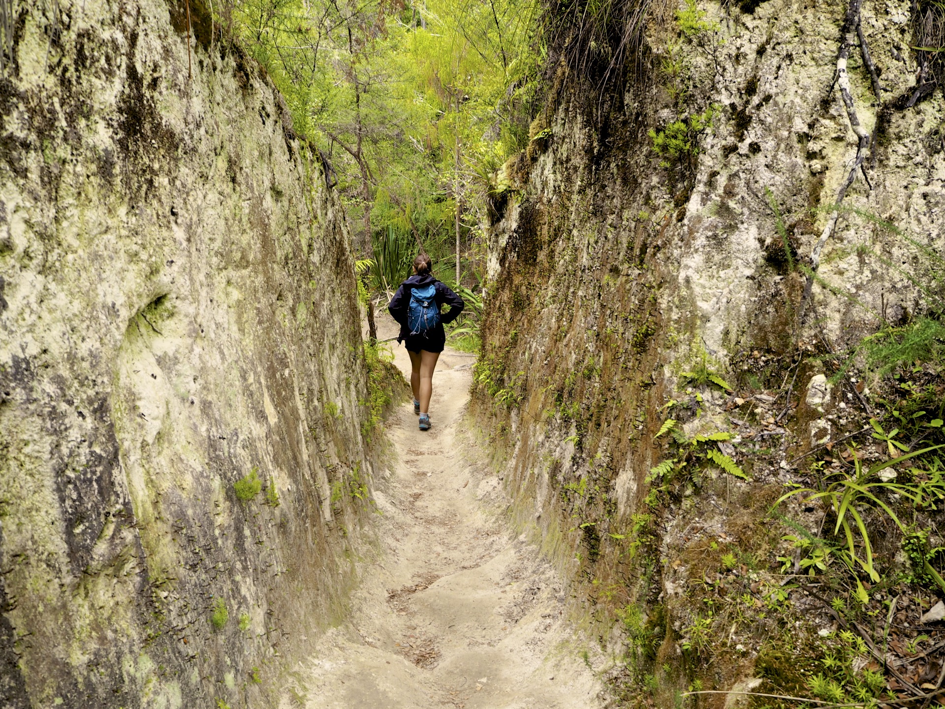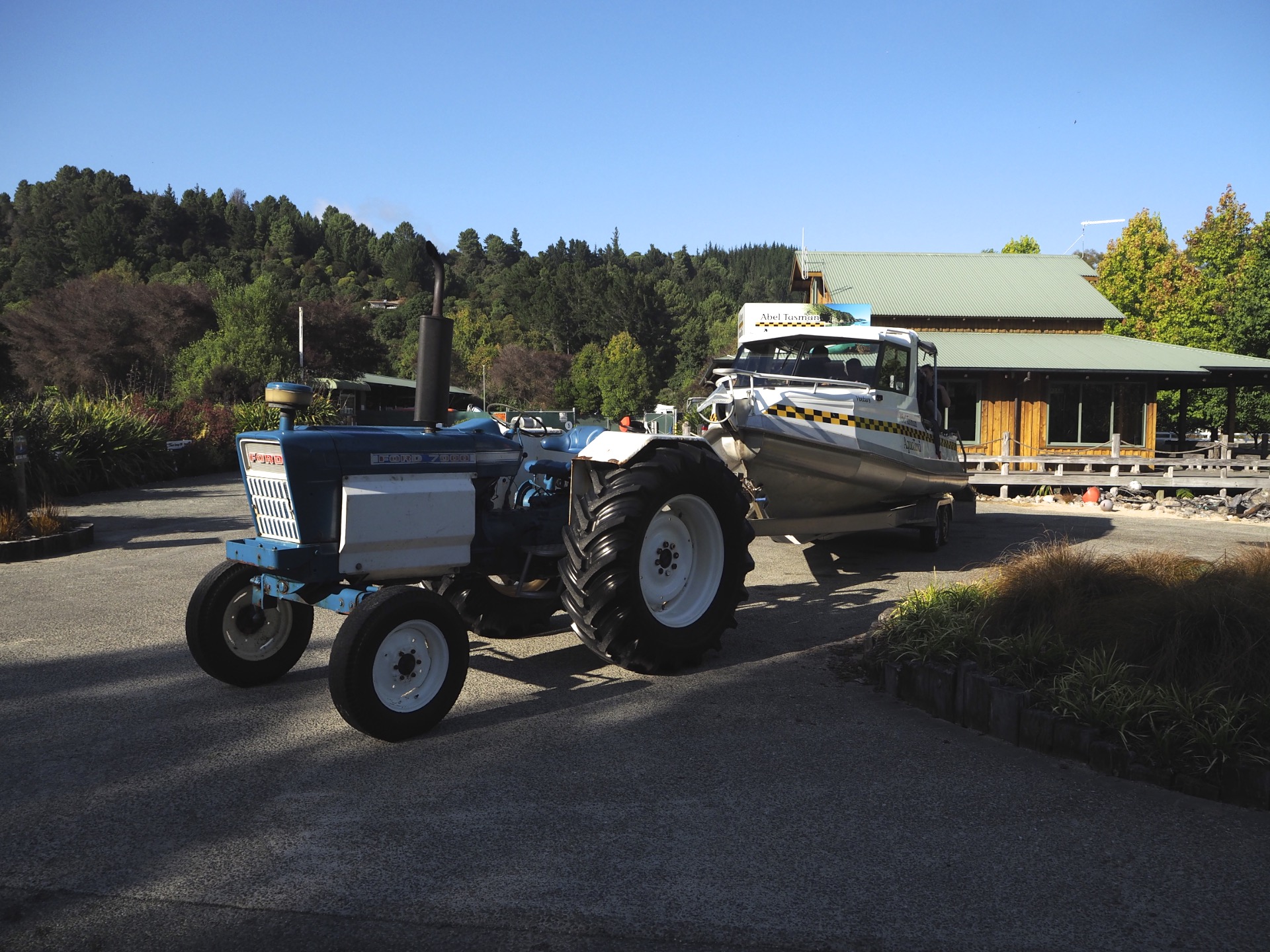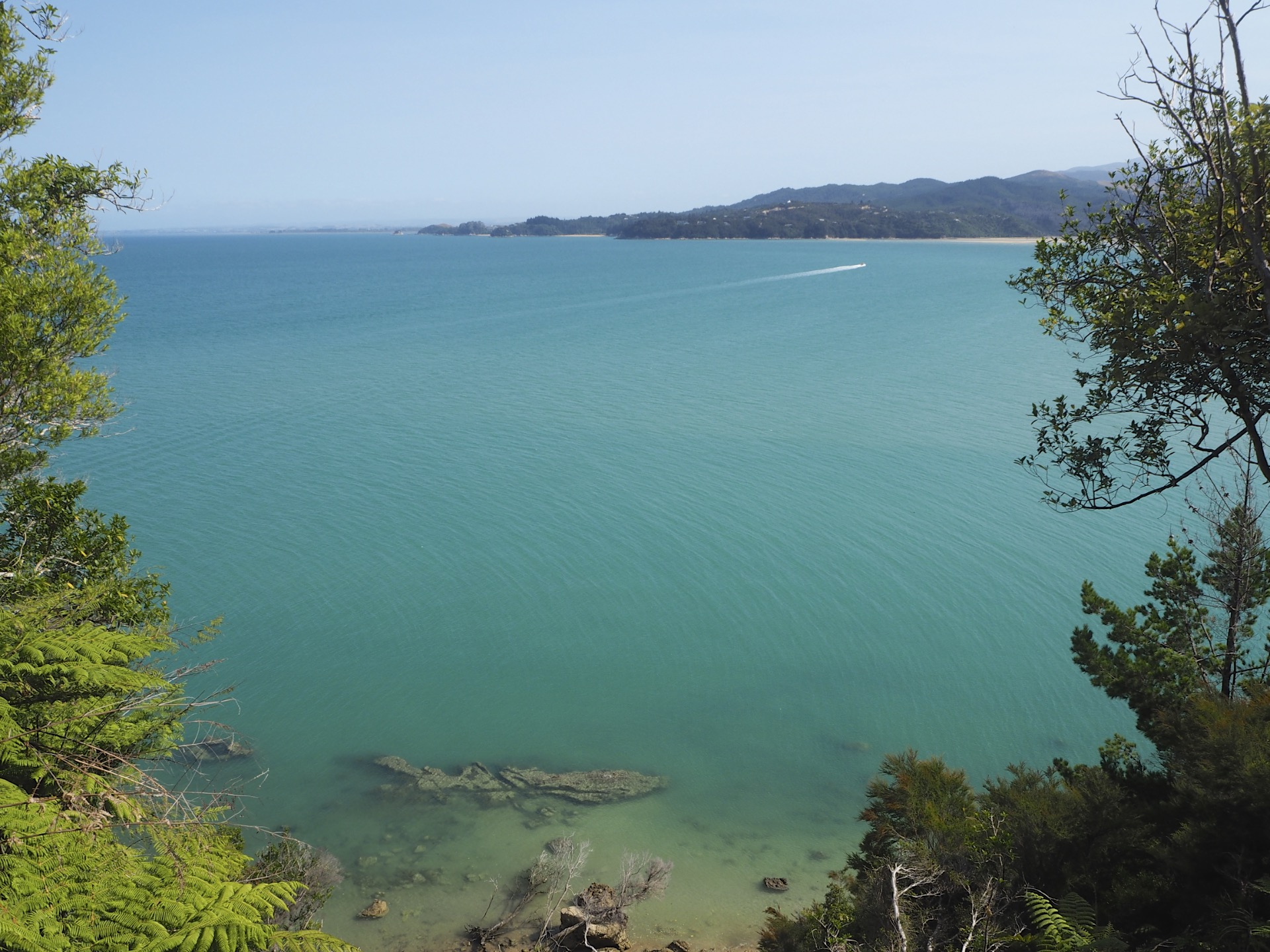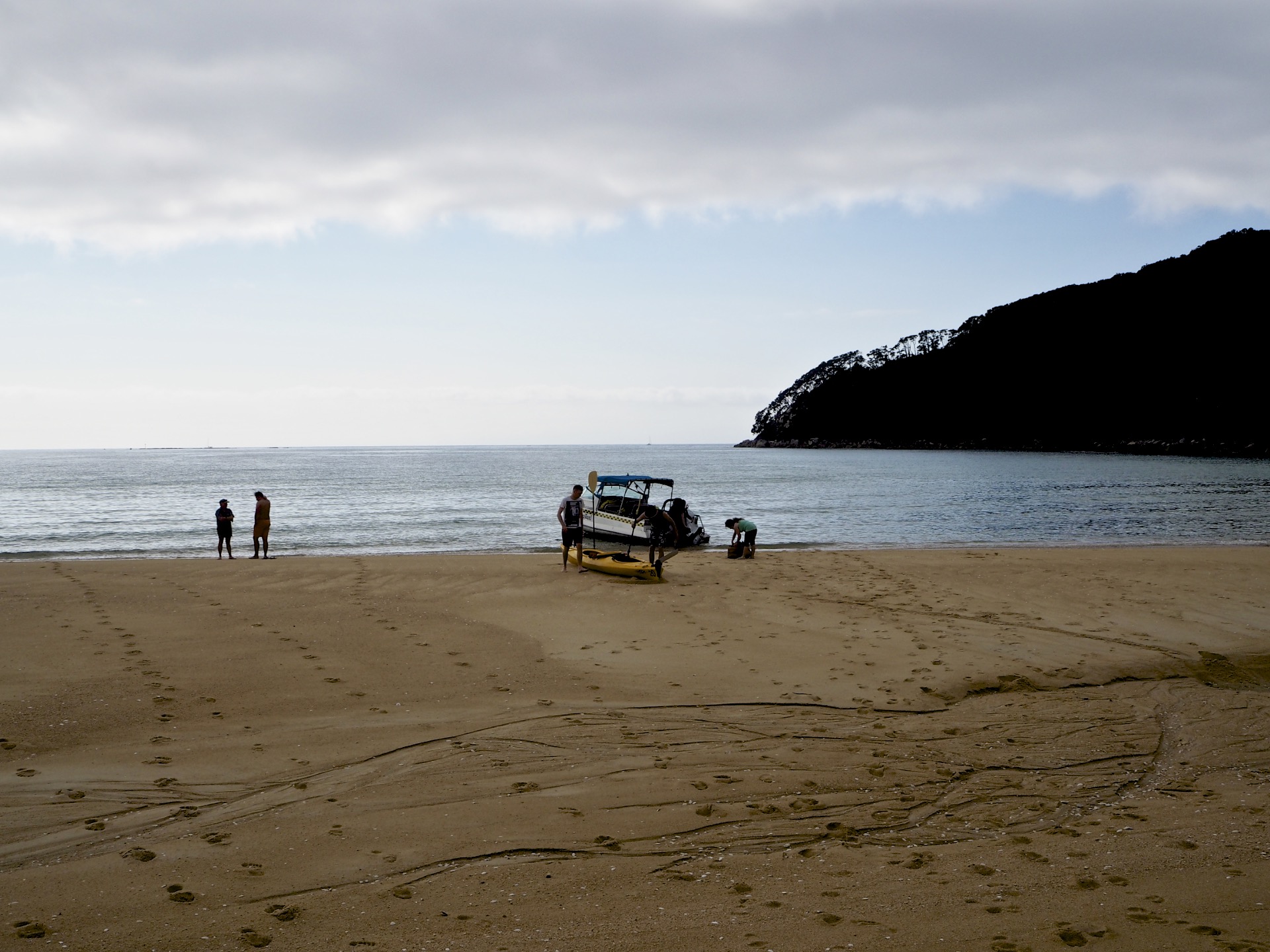 Llegamos a Marahau con la furgo, un pueblo donde se coge el water taxi. Es muy cachondo, porque como por la mañana la marea es más baja, tienen que entrar las lanchas encima de un tractor que les remolca hasta el agua. La gracia cuesta 40 pavacos por persona. Puedes no pillarlo y ir y volver caminando, pero de esta manera no haces el recorrido dos veces y puedes abarcar más trozo. Es decir, a nosotros nos dejaron en Bark Bay, y desde allí hay 23,5 km hasta donde teníamos la furgo, entonces lo hicimos caminando. Si no hubieramos cogido el water taxi, a los 10 km cm mucho nos hubieramos tenido que dar media vuelta, y vale la pena hacerlo así porque el paisaje cambia bastante en diferentes zonas y no se hace en absoluto monótono.