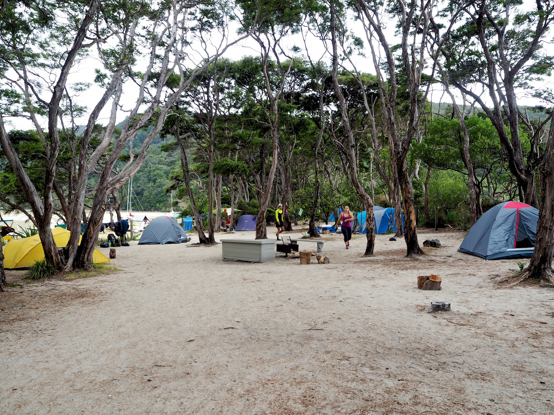 La ruta empieza en la playa, concretamente en Bark Bay. Lo primero que choca al llegar (si no has leído nada previamente como fue nuestro caso) es que en el punto donde te deja el water taxi, encuentras un campamento. Y no entiendes de donde salen y a donde van. Fue ahí cuando me enteré que puedes hacer en vez de un día de trekking (como nosotros), 3 días, 51 km, y ese es uno de los sitios para descansar la última noche. Lo tienen bien montado, hay hasta una cocina grande resguardada del frío.