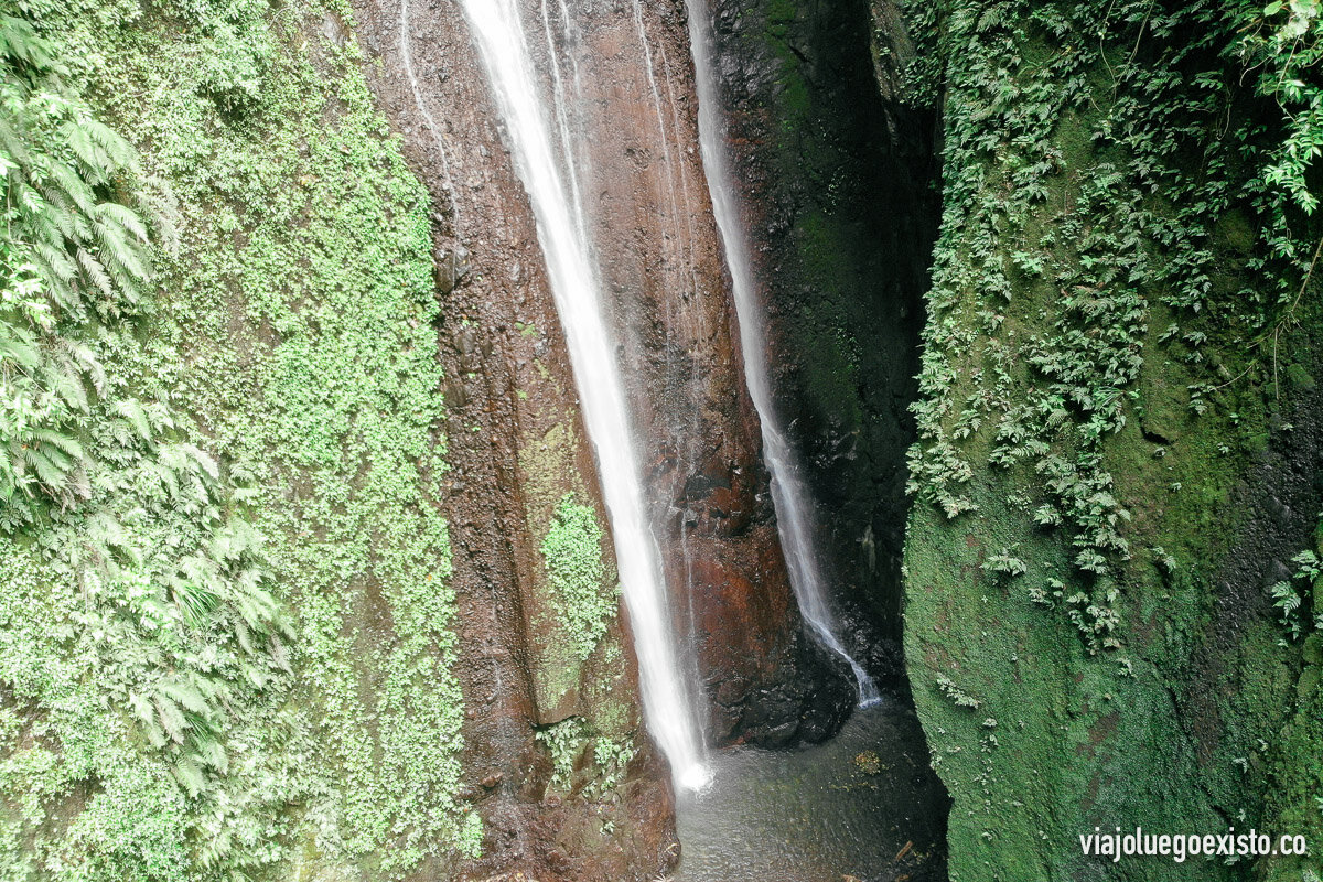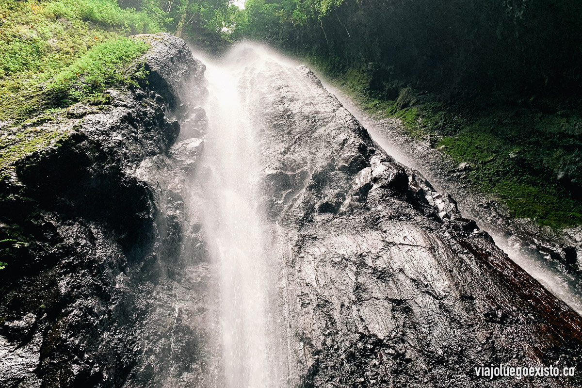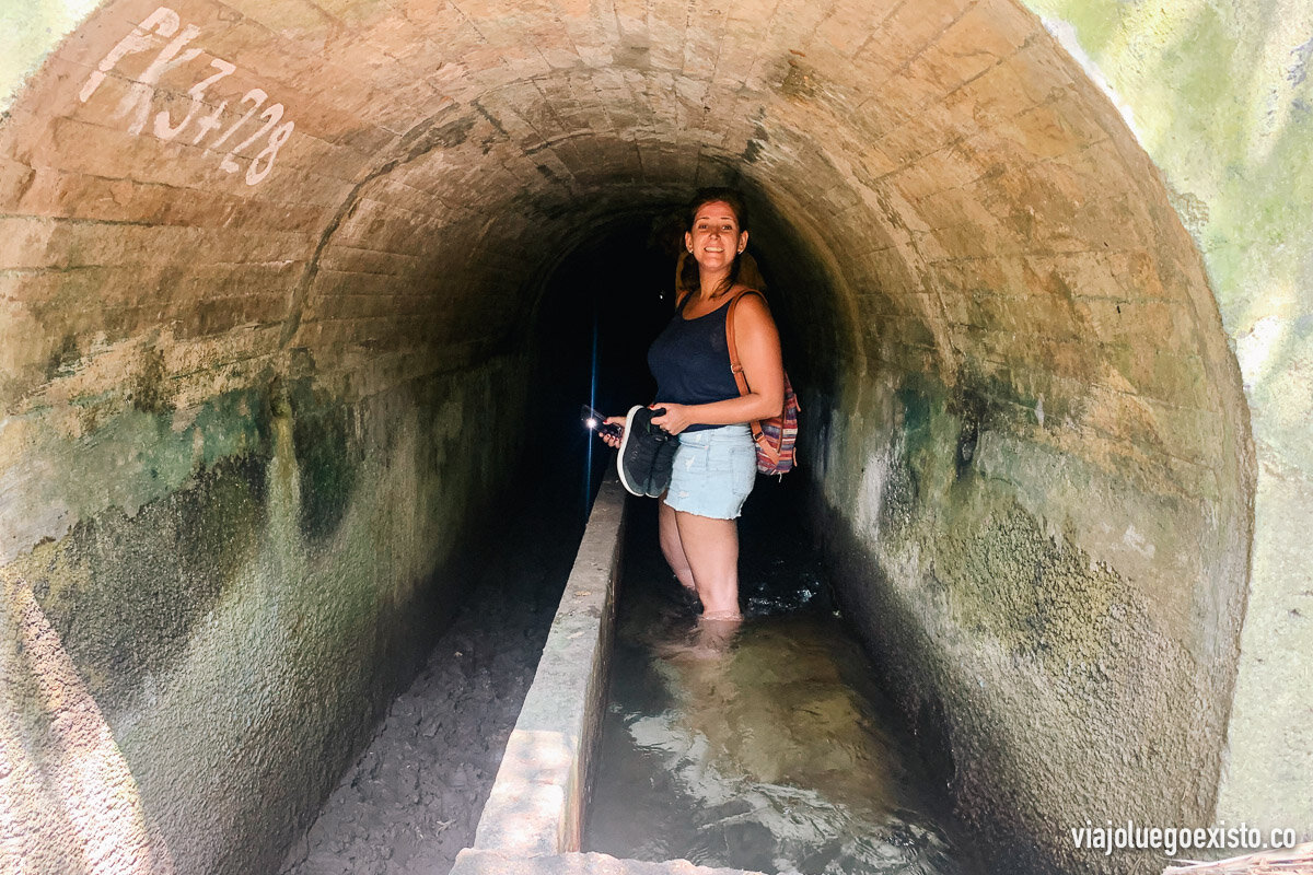 La caminata para llegar hasta la cascada es de 45 minutos sólo ida, es decir 1h y media de ida y vuelta más lo que te entretengas en la cascada. Llegando a la cascada, justo antes hay un túnel que lo tienes que atravesar. En nuestro caso el camino de dentro del túnel estaba completamente embarrado y oscuro, y tuvimos que hacerlo por dentro de un canal por donde pasaba el agua hasta la altura de las rodillas y fue bastante divertido (pero muy probablemente solos no nos hubiéramos metido).