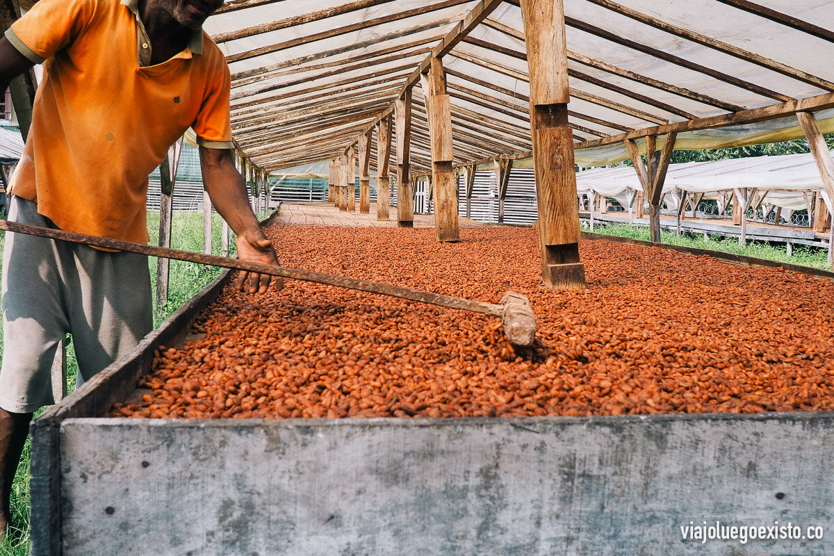 En la cooperativa nos explicaron todo el proceso del cacao. Vimos árboles de cacao y su fruto, el proceso de fermento que consta de unas cubas más pequeñas y otras más grandes por donde pasan los granos un total de 7 días. Después pasan a la zona de secado, a la que puedes acceder sin problema y te explican que mueven los granos manualmente con un rastrillo de 1 a 3 horas diariamente.