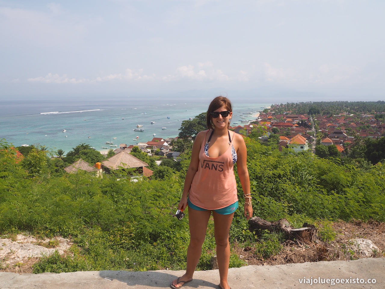 Al día siguiente de llegar alquilamos una moto por 50.000 IDR (rupias de indonesia, 3€ aprox.) y recorrimos la isla (tiene una extensión de unos 8km cuadrados), hay muchos sitios para visitar, de hecho un día puede quedarse corto si lo quieres ver casi todo, además que no se puede ir muy rápido ya que las calles suelen estar en mal estado. Nuestra primera parada fue Panorama Point, el punto más alto de la isla desde donde hay unas vistas espectaculares de Jungut Batu, lleno de palmeras y pequeñas construcciones.