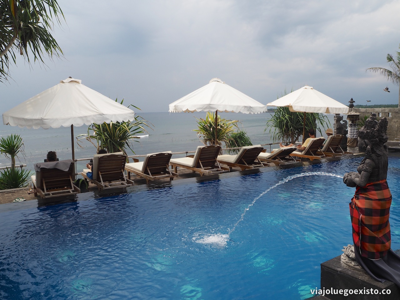 Paramos a comer en el sur de la isla, muy cerca del puente que une Nusa Lembongan con Nusa Ceningan (un puente muy estrecho donde cabe una moto y poco más), que cruzaríamos más tarde para recorrer la isla más pequeña de las 3 que forman el distrito de Nusa Penida. Nos encantó todo lo que vimos en Ceningan, fuimos a Secret Beach, a Blue Lagoon y acabamos por casualidad en Twilight, un bar-restaurante con mucho encanto, situado en un acantilado con vistas espectaculares y con piscina y tumbonas. Pasamos un rato de relax increíble.