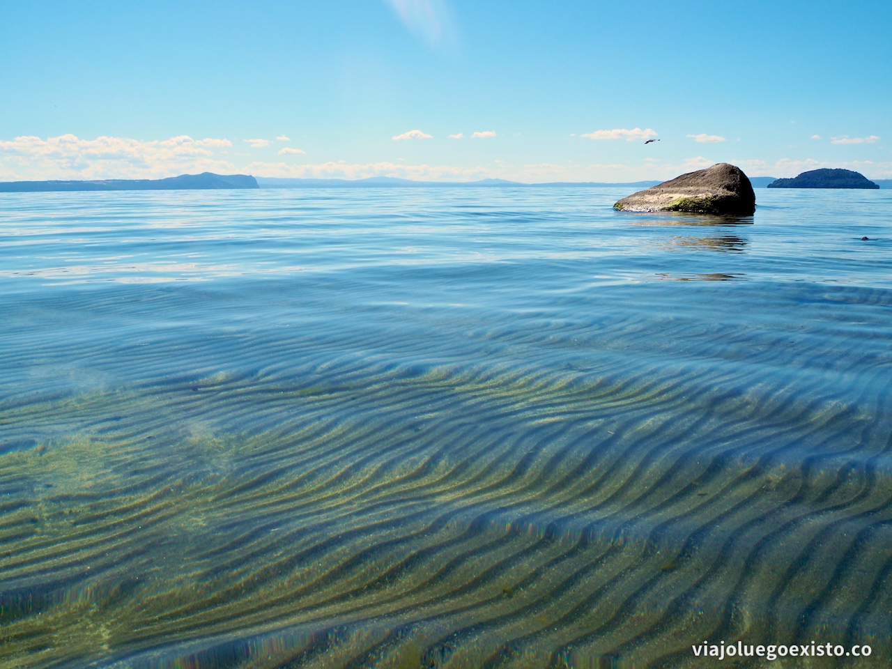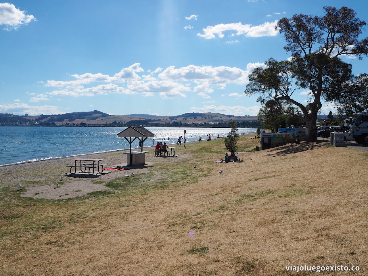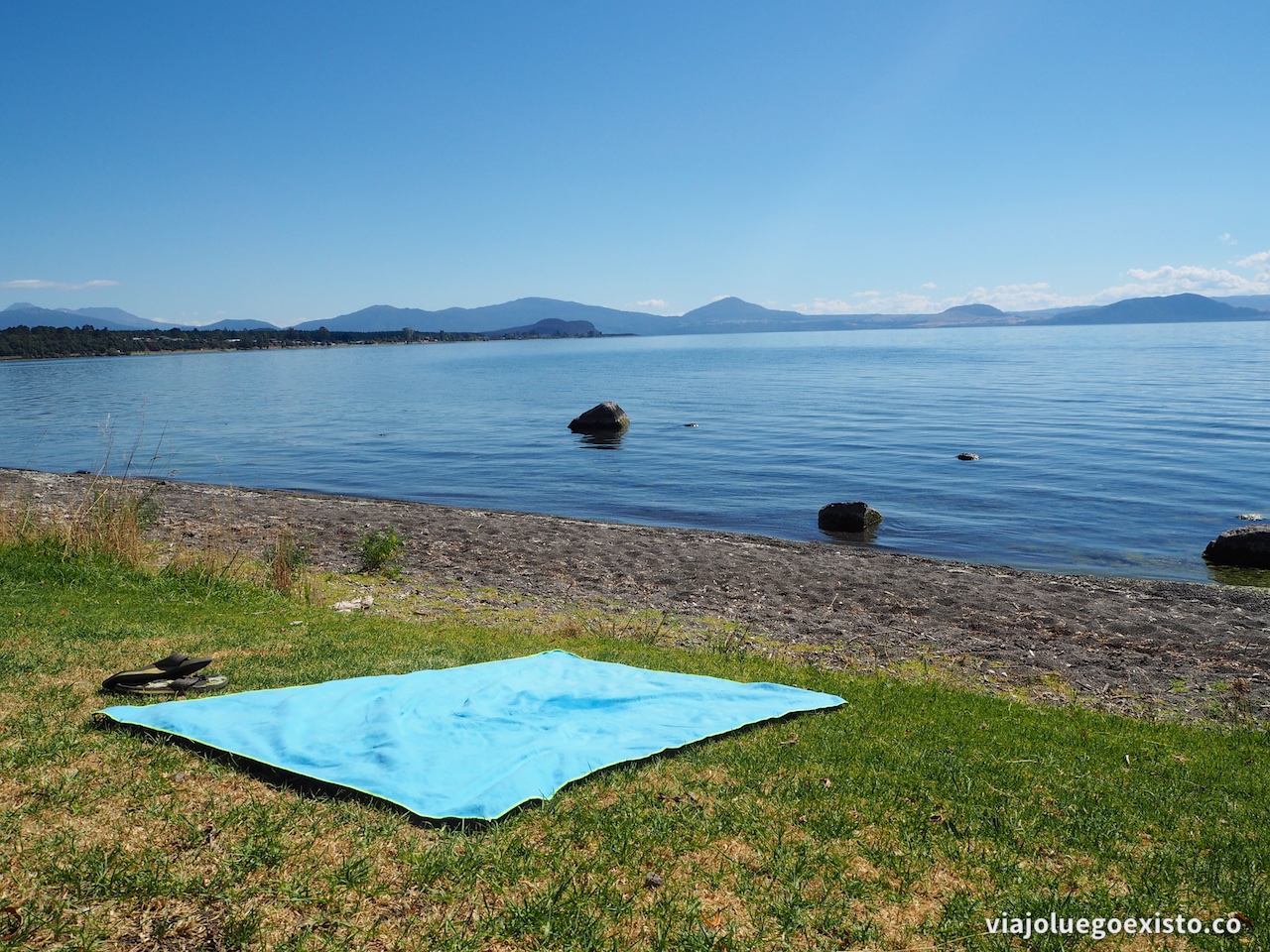 Al acabar el trekking del Tongariro Alpine Crossing nos dirigimos hacia Rotorua, de camino nos paramos en el lago Taupo, el lago más grande de Nueva zelanda, con aguas tranquilas, ideales para darse un baño y reponer fuerzas después de la caminata, nosotros paramos en medio de la nada, pero en el pueblo de Taupo la zona del lago está más preparada, con mesas, bancos y aparcamiento para pasar un rato agradable.