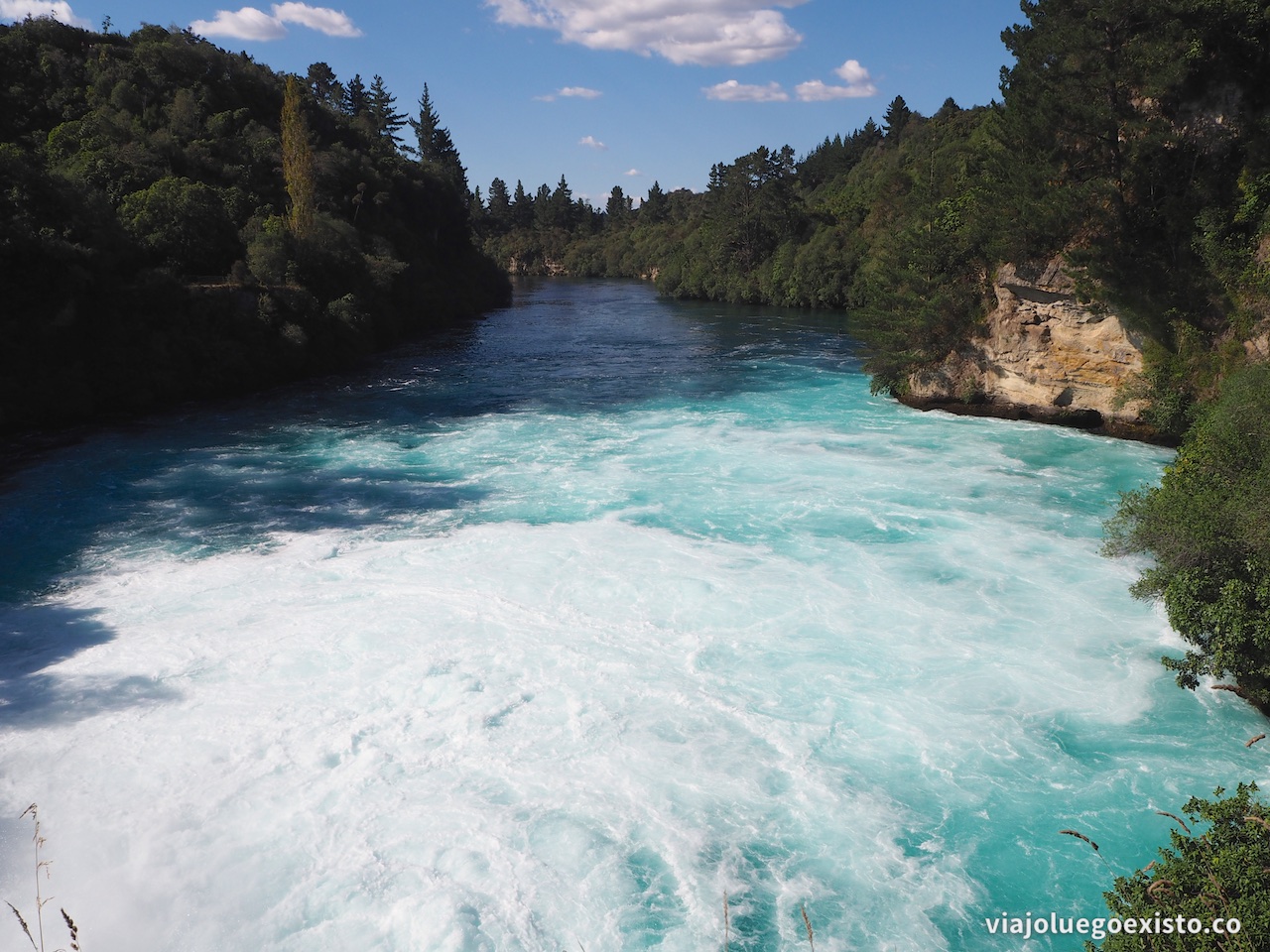 Aprovechando que estábamos cerca también pasamos a ver las Huka Falls, donde el río Waikato se estrecha tanto que forma unos rápidos con mucha fuerza y con un azul turquesa de película, por eso debe ser que ahí rodaron la escena de los enanos bajando en barriles en El Hobbit: la desolación de Smaug.