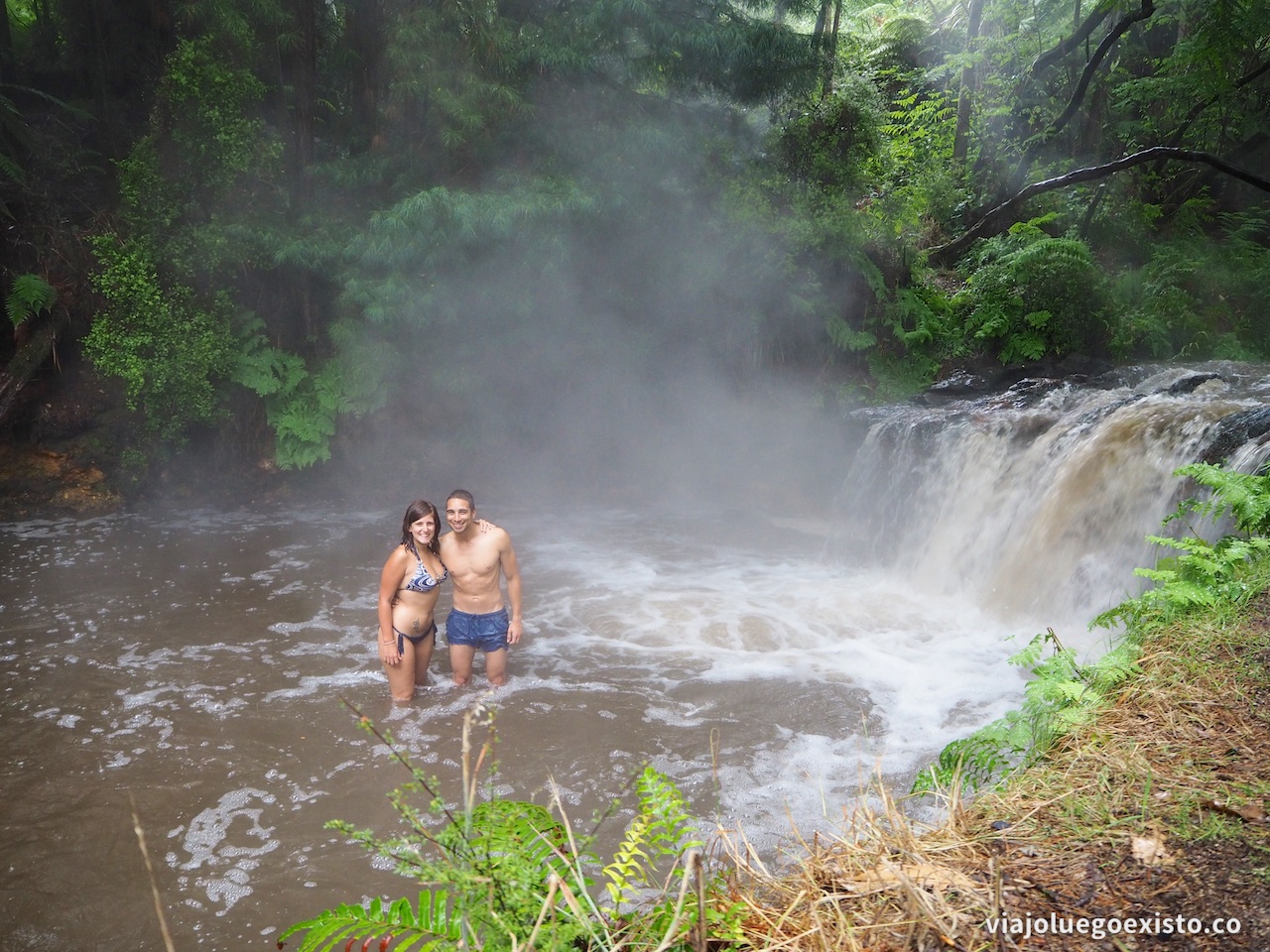 Ese día por la tarde fuimos a Kerosene Creek, estuvimos a punto de saltárnoslo porque llovía y menos mal que finalmente fuimos porque fue de lo mejor de Rotorua. Después de meternos con el coche en un camino de tierra lleno de baches llegamos a un río, nos pusimos el bañador, nos empapamos por la lluvia y cuando caminamos un poco encontramos un salto de agua y una poza perfecta para darse un baño, pero un baño realmente especial, rodeado de vegetación, lloviendo y con la peculiaridad de que el agua estaba calentita (y olía un poco a azufre eso sí).