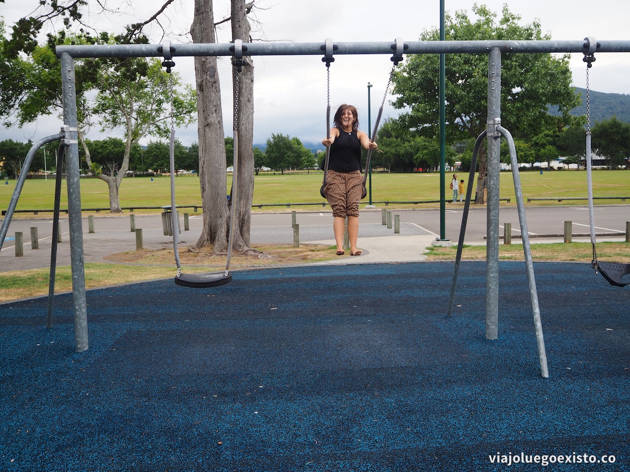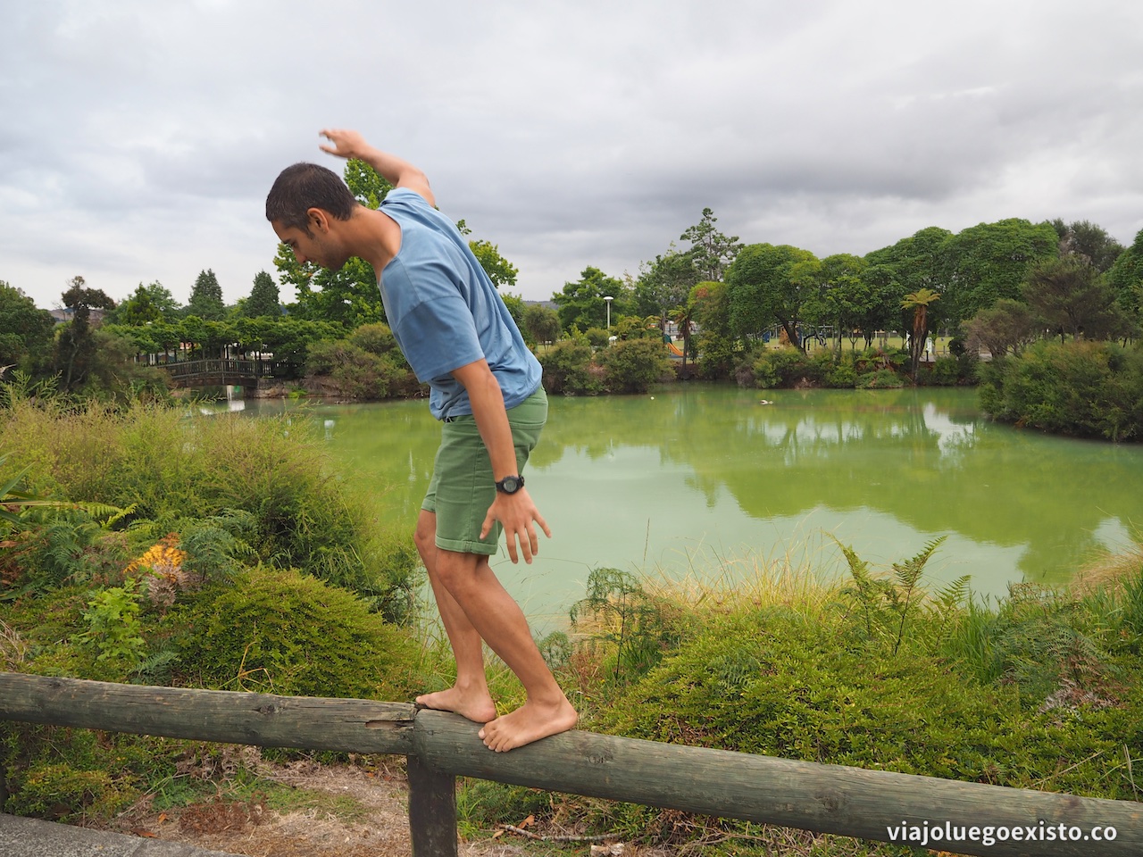 Después de quedarnos arrugados volvimos a Rotorua y como había dejado de llover fuimos a pasear a Kuiruau Park, donde nos lo pasamos genial entre columpios, lagos, mucho verde y piscinas calientes.