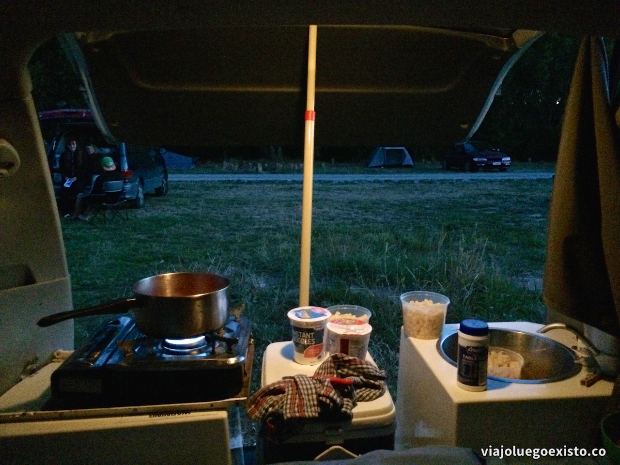 Con toda nuestra pena, decidimos dormir en Herbert Forest Camping Ground, un camping precioso, con mucho sitio para acampar, unos lavabos súper limpios y una cocina cerrada donde poder resguardarte del frío. Son 10 NZD por persona, que no es barato precisamente, pero creo que los servicios que ofrecen valen mucho la pena. Dormimos muy bien, y al día siguiente nos acompañó durante el desayuno el perro de la dueña con el que estuvimos jugando, bueno más bien Marcio, porque el cabrón sólo le devolvía la piedra a él aunque se la tirara yo.