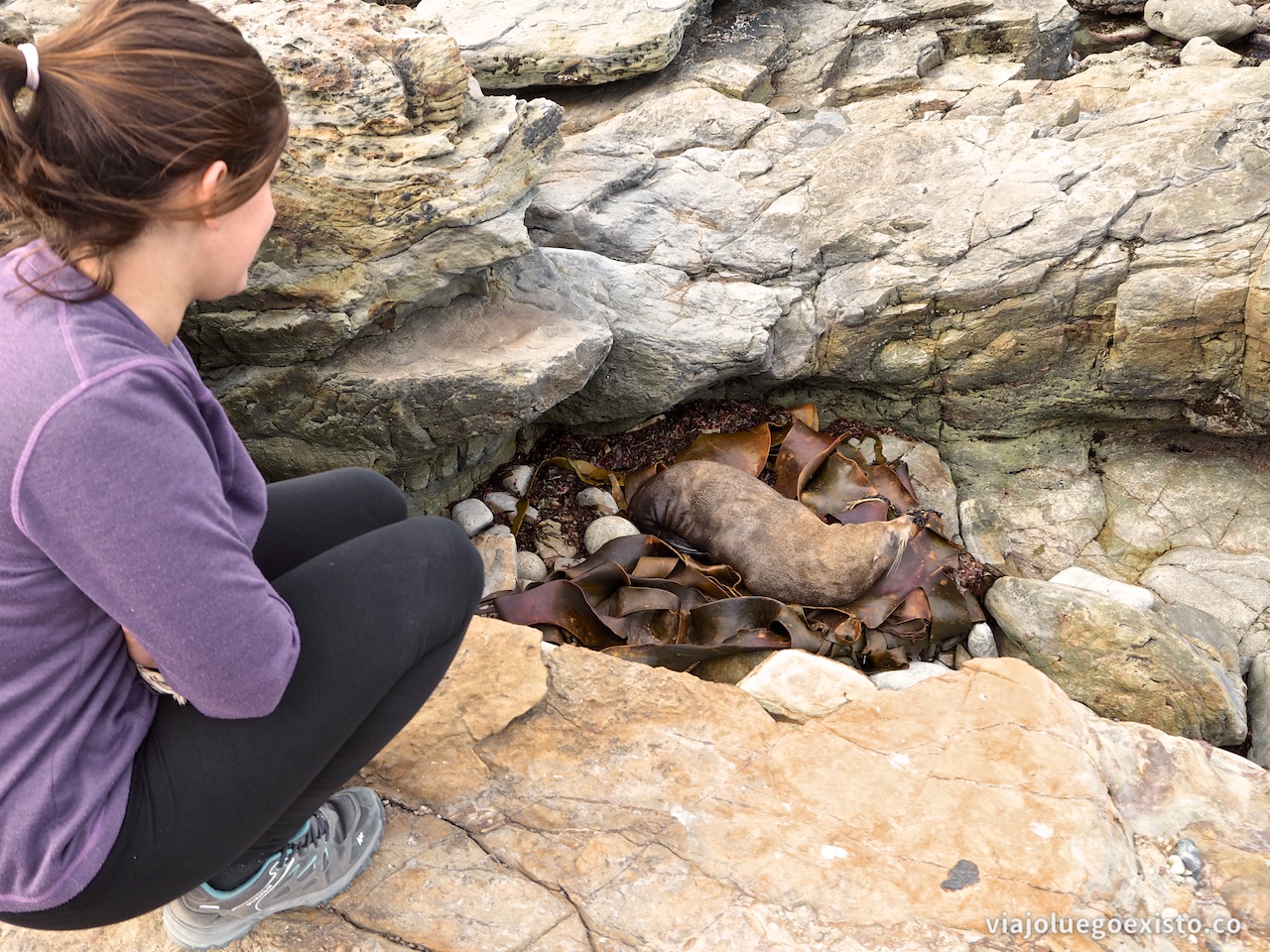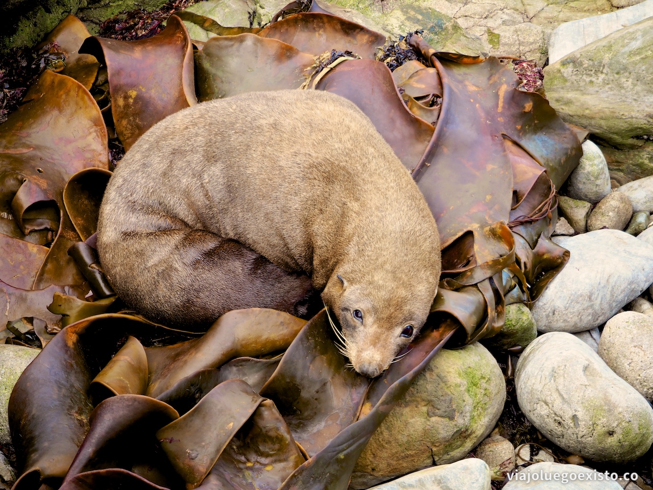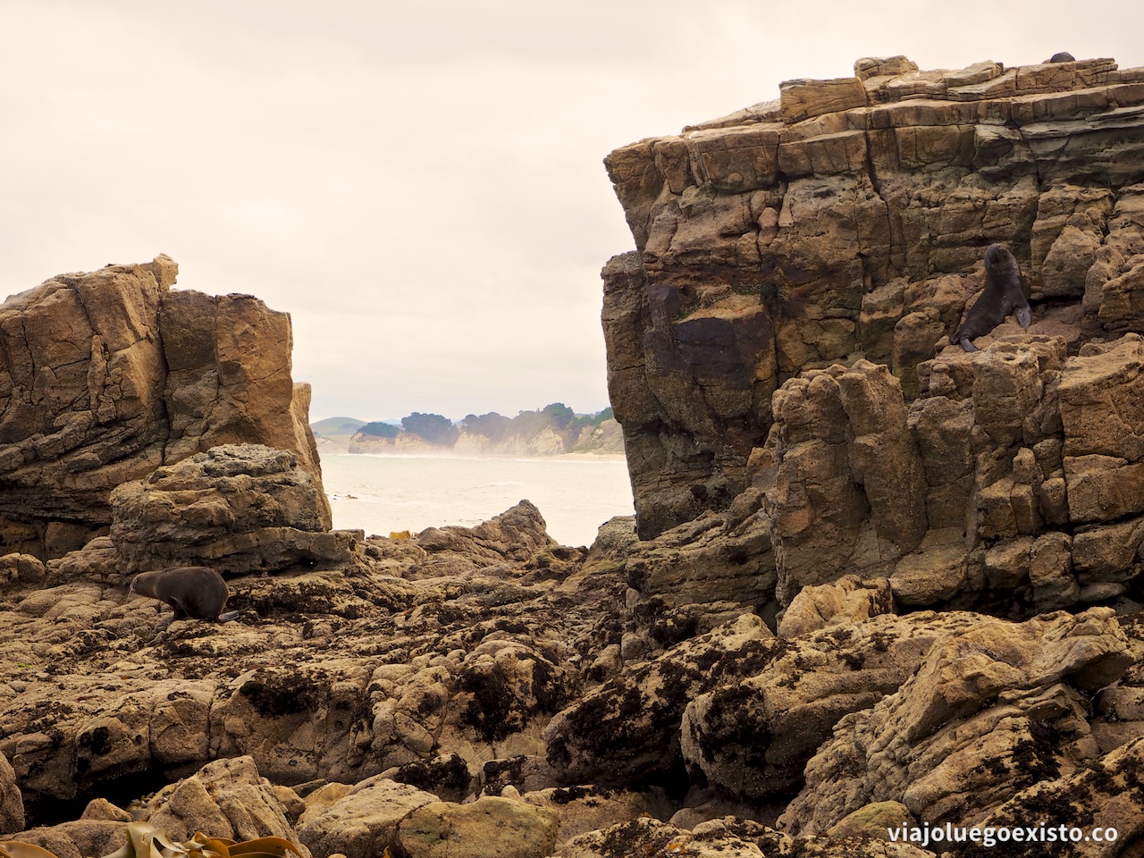 Con el cuerpo un poco descompuesto por las novedades, nos vamos hasta el faro, y vemos subir a varias parejas de turistas, que nos comentan entusiasmados que han visto pingüinos. Dios! Qué bien! Pues justo cuando empezamos a bajar las escaleras del faro para ir a verlos, sube una señora con candados cerrando el camino y diciendo que cierran a las 17.30h, que volviéramos al día siguiente. Se la chupó un pie que le contáramos por activa y por pasiva que nos era imposible porque nos teníamos que ir en avión, así que nos quedamos con las ganas de verlos. Tal era nuestra frustración que volvimos a Shag Point por si se obraba un milagro y los pingüinos que hacía tiempo que no pasaban por allí, decidían hacer acto de presencia y arreglarnos el día, pero no tuvimos suerte tampoco, y después de esperar más de 1 hora y media lo máximo que vimos fueron lobos marinos.