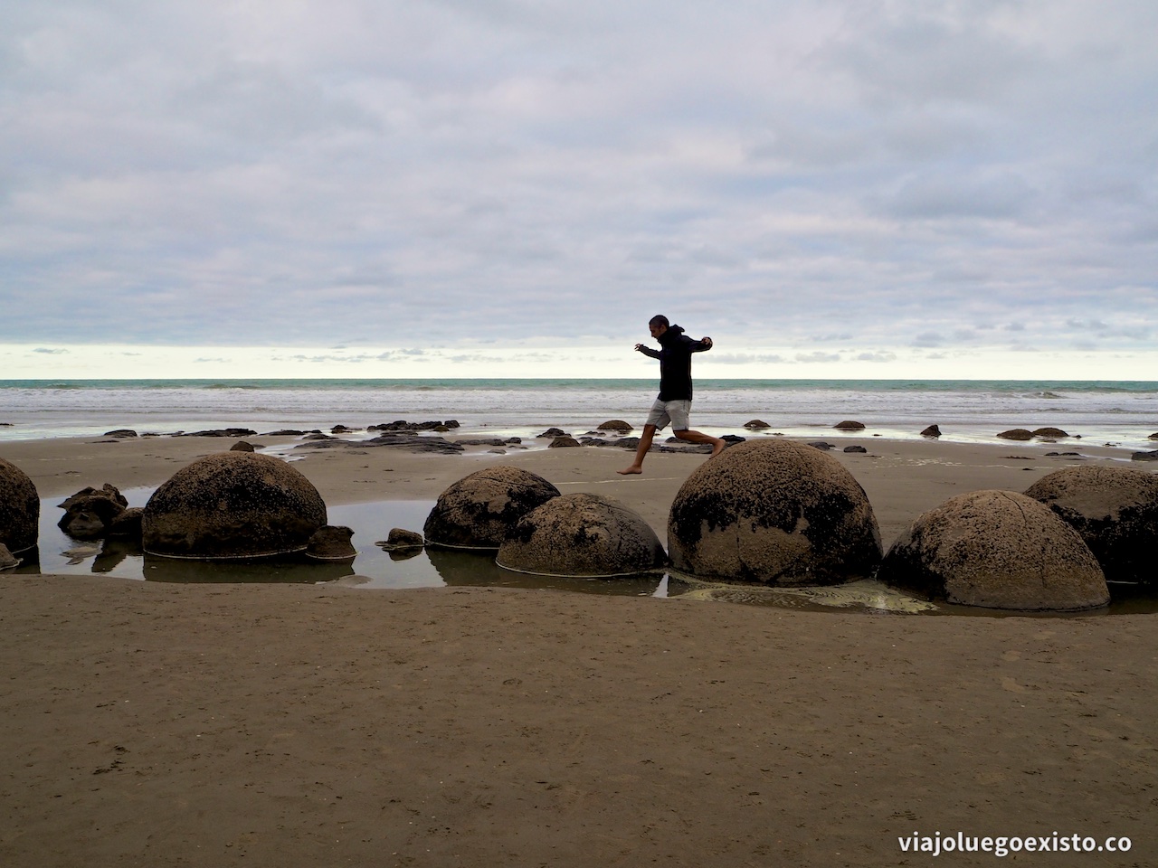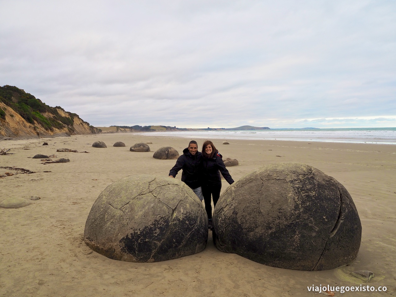 Nos sobraba un día hasta nuestro siguiente vuelo, y teníamos varias opciones para ver en Nueva Zelanda. Yo había mirando por internet los Moeraki Boulders y convencí a Marcio para ir. Nos quedaba bastante lejos de donde estábamos, como unas 4 horas sólo ida, y 8 horas con nuestra camper implicaba mucha pasta en gasolina, pero decidimos bajar y verlo, las fotos en internet prometían mucho.